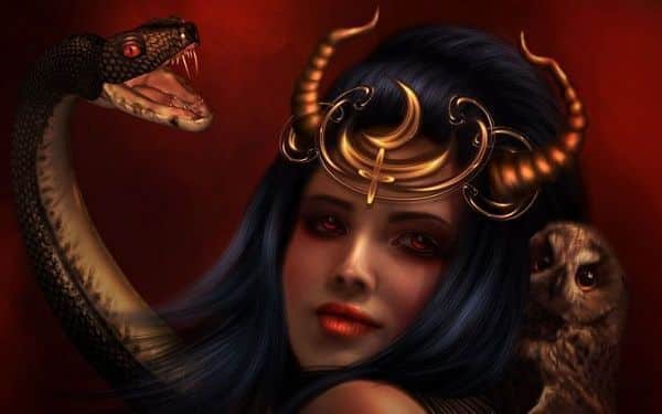 Allá dentro, iluminada por las llamas que rodeaban la cavidad, estaba el lecho de Satán, sobre el cual se encontraba, voluptuosa y aparentemente dormida, una mujer de siniestro aspecto: serpientes en vez de cabello como Medusa, un único ojo –ahora cerrado– en la frente como Cíclope, cuerpo cubierto de escamas, pechos aplastados por los que se escapaba un mortífero veneno, manos y pies con garras como las de un ave de rapiña…