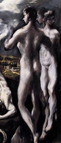 A la derecha, permanecen en pie dos figuras enigmáticas. Una masculina, otra femenina. La identidad de esta misteriosa pareja ha suscitado diversas interpretaciones, de índole pagana o cristiana. Cossío suponía que eran Apolo y Artemisa. Para otros, también podría tratarse de Poseidón y Casandra, Apolo y Antíope, París y Atenea, o incluso Adán y Eva. Quizá sea ésta última la hipótesis más correcta, al colocar a los primeros padres de la Humanidad -quienes también cometieron un grave error, costándoles la salida del paraíso- para otorgar un sentido católico a esta imagen profana. En cuanto a la presencia femenina, luego de una restauración del año 1955-56, se descubrió otra cabeza. La mujer presenta así una dualidad jánica: un rostro hacia adelante, y otro se extiende hacia atrás. La especulación respecto al significado de estas figuras enigmáticas y sus extraños detalles (como el brazo masculino que deviene nube, o la cabeza femenina doble), puede ser estéril si recordamos la fuerte posibilidad de que estas rarezas sólo se deban al hecho de que El Greco no alcanzó a terminar la pintura, pues murió en abril de 1614.